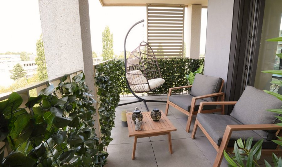 Частный балкон площадью 18 м² с видом на красивый парк Gasperich - идеальное место для отдыха или развлечений с открытым видом на зеленые пространства. Просторный дизайн с панорамными окнами и отсутствие препятствий для обзора создают атмосферу простора и света.