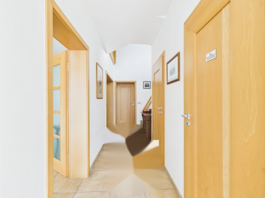 На первом этаже расположена посадочная площадка в 14 м² и четыре спальни площадью приблизительно 15, 16, 17 и 17 м², а также ванная комната 11 м² с двойной раковиной, ванной, душем, туалетом и биде. В подвале находится гараж площадью около 60 м² для двух или трех машин, котельная 9 м², прачечная 10 м², кладовка 6 м², погреб 16 м² и мусорная комната 6 м².