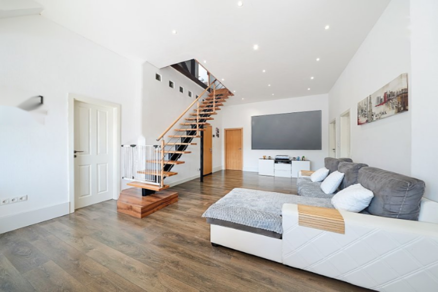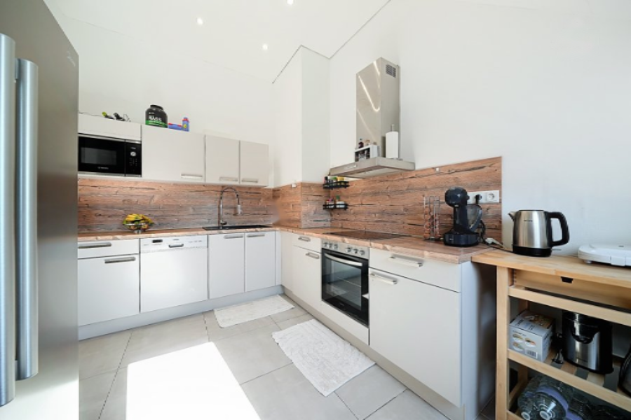 При входе вы попадаете в просторную гостиную площадью 41 м², наполненную естественным светом, которая соединена с функциональной кухней.