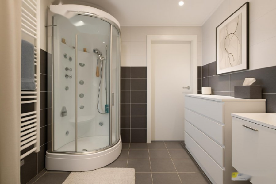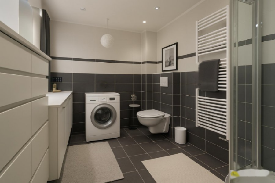 В квартире имеются 2 спальни и одна изысканная ванная комната с душем с гидромассажем, тумба с двойной раковиной, шкаф для хранения и подключение для стиральной машины и сушилки.