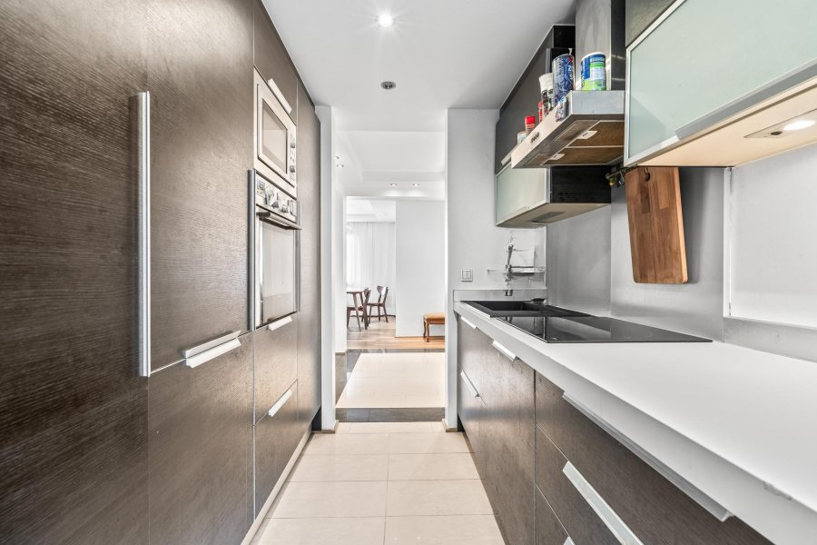 Квартира включает: входную зону, 20 m² гостиную/столовую, спальню 15 m² с встроенным шкафом, душевую с туалетом, спальню 9 m² с выходом на террасу, отдельную кухню с выходом на террасу, террасу 12 m² без соседей напротив. Две частные кладовые (4-5 m²) дополняют собственность.