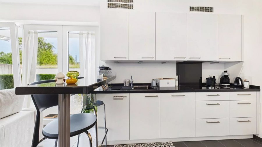 Квартира включает в себя: прихожую с гардеробом, светлую гостиную с современной открытой кухней и прямым выходом на террасу, просторную и функционально оформленную спальню, а также современную душевую комнату с туалетом. В дополнение имеется частное парковочное место в безопасном подземном гараже и индивидуальный подвал для хранения.