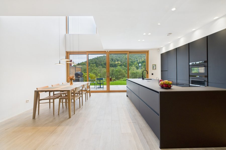 Комфорт обеспечивается встроенной кухней с техникой AEG, подогревом полов, системой домотики и сигнализацией. Окна с тройным остеклением из дерева и алюминия, панели для солнечной электроэнергии и моторизованные двери гаража добавляют современности. Ступеньки из дерева, а также современный железный перила подчеркивают стиль. Дом расположился в районе, сочетающем спокойствие и природную красоту, в нескольких шагах от начальной школы и с удобным доступом к транспортной сети и деловым центрам столицы.