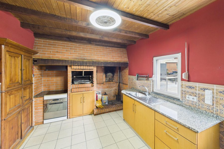 На первом этаже: есть прихожая, большая светлая гостиная с дровяной печью, недавно оборудованная кухня, отдельный туалет, прямой выход на террасу и сад, оборудованная подсобка с летней кухней (духовка, барбекю и варочные панели) и двойной гараж с прачечной.