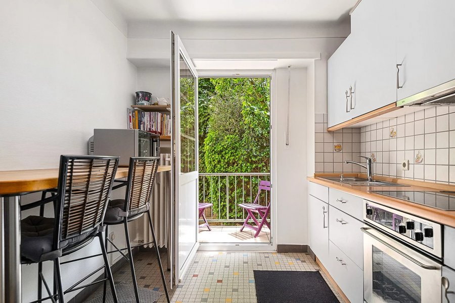 Западная ориентация квартиры, общая площадь около 60 м². Квартира расположена следующим образом: на первом этаже выходит красивая прихожая с отдельным туалетом и гардеробной. С одной стороны, переходящая в просторную светлую гостиную около 25 м², включающую зону отдыха и столовую с западной экспозицией и захватывающим видом на улицу. С другой стороны, прихожая ведет к отдельной прекрасно оборудованной кухне около 10 м² с очаровательным балконом, ванной комнатой с ванной и удобной спальней около 14 м² на стороне сада.