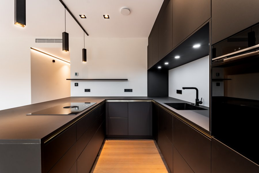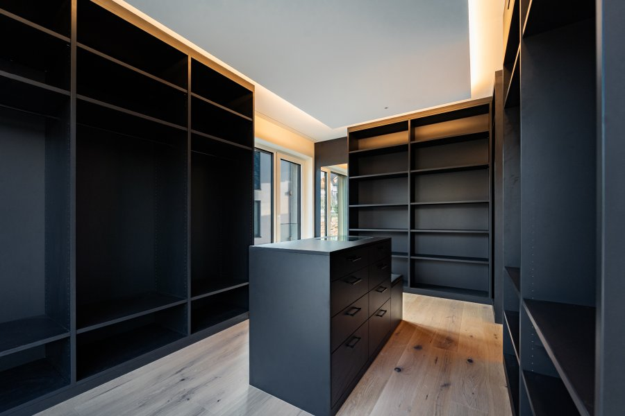Просторная гостиная выходит на террасу площадью 25 м², оборудованную моторизованным навесом, встроенным LED-освещением и автоматической защитой от внешних глаз. Высококачественная открытая кухня Häcker оснащена современными приборами Siemens.
