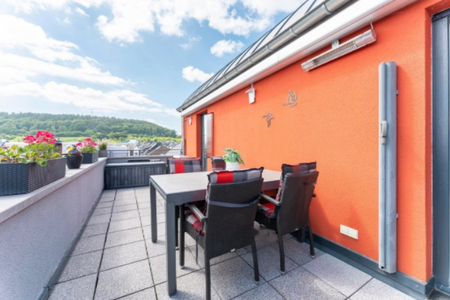 Дополнительно предлагаются две террасы, выходящие на восток и запад (всего ±50 м²), с джакузи, маркизами и зоной для барбекю, частный погреб, два крытых парковочных места, одно из которых можно переоборудовать в закрытый гараж, общая прачечная и лифт.