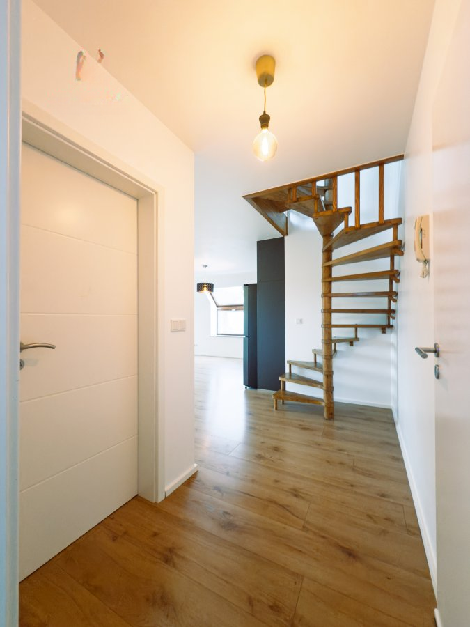 На втором этаже находится столовая/гостиная с выходом на балкон, открытая, полностью оборудованная кухня, две спальни, ванная комната с туалетом, умывальником, душем, полотенцедержателем и подключением для стиральной машины, а также сам балкон.