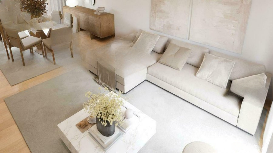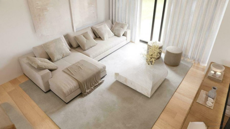 Апартаменты имеют жилую площадь около 87 м², включающую просторную и светлую гостиную с выходом на две большие террасы: первая площадью 8 м² и вторая 20 м², ориентированная на юг, прилегающая к кухне.