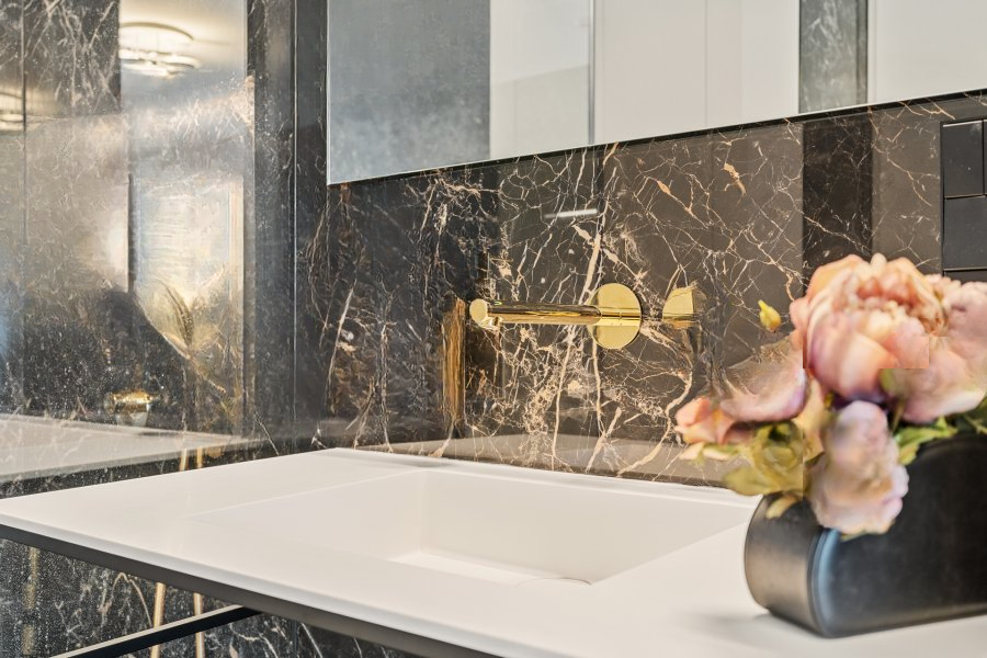 Открытая кухня в белом лаке привлекает своими современными линиями и функциональностью. Спальня, оформленная со вкусом, имеет прямой выход на балкон и оборудована встроенными шкафами и роскошной душевой комнатой с черным мрамором и золотыми элементами.