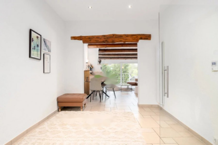 Дом прошёл несколько этапов ремонта: полностью обновлённый фасад, установка новых высокоэффективных тройных стеклопакетов и отремонтированные полы в подвале. Кухня была обновлена в 2022 году и оснащена качественной техникой. В жилой зоне видны открытые деревянные балки, имеется камин, а большие окна открываются в сад с деревьями, живой изгородью и розами, создавая приятную атмосферу.