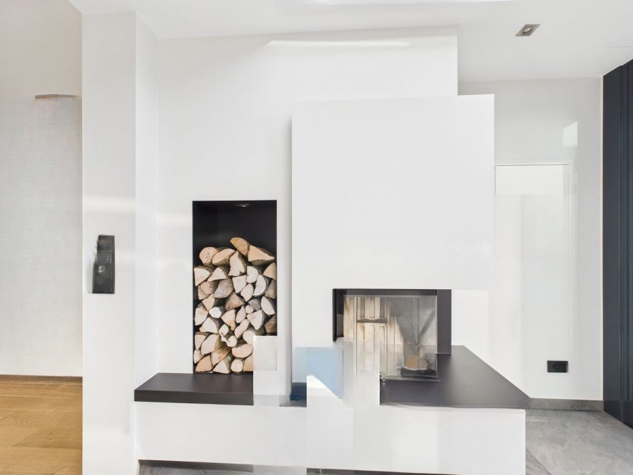На первом этаже находится просторный вестибюль площадью 18 м² с мебелью на заказ и отдельный туалет площадью 2 м². Далее расположена жилая зона площадью 78 м², включающая гостиную/столовую с открытой кухней и верандой. Отсюда открывается доступ на деревянную террасу площадью 25 м² с джакузи и огороженным от посторонних взглядов садом, ориентированным на юго-восток. Также на этом уровне находятся двойной гараж площадью 32 м² и подвал 9 м².