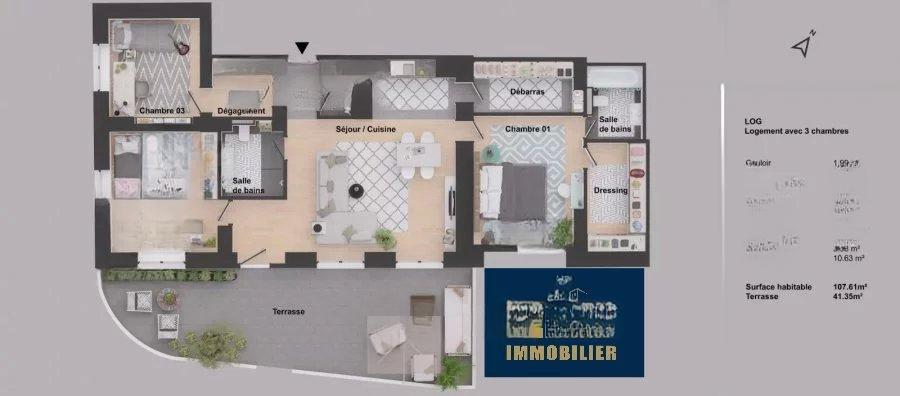 surface: 106 m², rooms: 3, bathrooms: 2, garages: 1;
