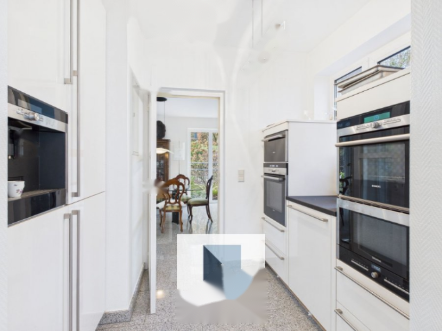 Полностью оборудованная кухня Siemens включает в себя подогреватель для тарелок, морозильник, холодильник, духовку, микроволновую печь, пароварку, индукционную варочную панель, вытяжку и встроенную кофемашину, а также обширное пространство для хранения.