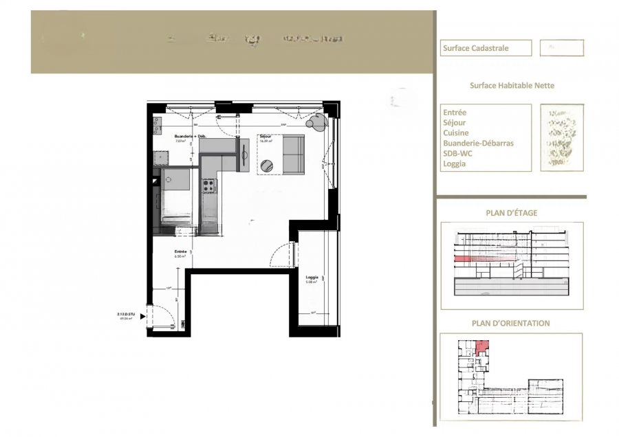 Квартиры отличает тщательная внутренняя отделка: плитка или паркет по вашему выбору, стены с краской Variovlies, качественные межкомнатные двери, и ванные комнаты с санфаянсом Duravit, Villeroy & Boch и Hansgrohe. Комфорт усиливается системой отопления через пол и двухпоточной вентиляцией, создающими здоровую и уютную атмосферу. Студия расположена на первом этаже с кадастровой площадью ±47.81 м² и включает кухню площадью ±9.31 м², соединенную с гостиной площадью ±17.71 м² с большими панорамными окнами, душевую с WC площадью ±5.44 м², и прачечную/кладовую площадью ±4.05 м².