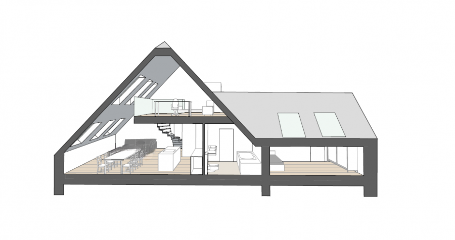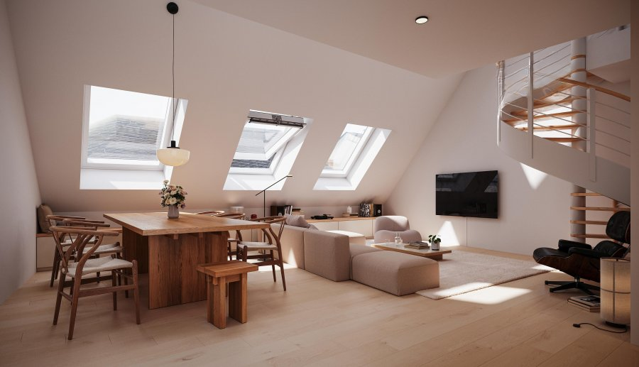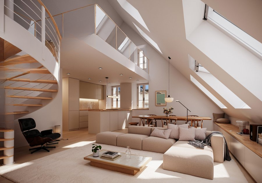 Просторная жилая и обеденная зона образует центр нижнего уровня и насыщена дневным светом благодаря многочисленным мансардным окнам. Открытая кухня органично вписывается в жилое пространство. Открытая галерея соединяет оба уровня и придаёт квартире особую простоту и архитектурную глубину.