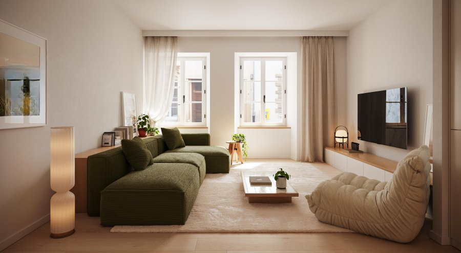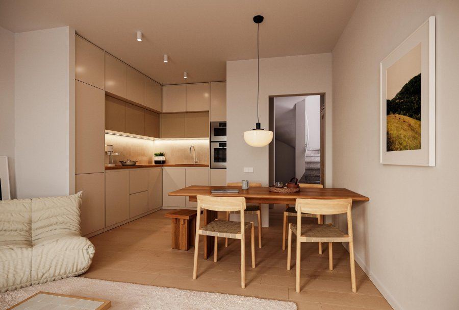 Просторная гостиная и столовая являются центральной частью нижнего этажа, предлагая много места для повседневной жизни и встреч. Большие окна создают светлую, открытую атмосферу. Открытая кухня гармонично вписывается в жилое пространство. Элегантно сохраненная и вновь интерпретированная лестница соединяет уровни и ведет в приватную зону квартиры.