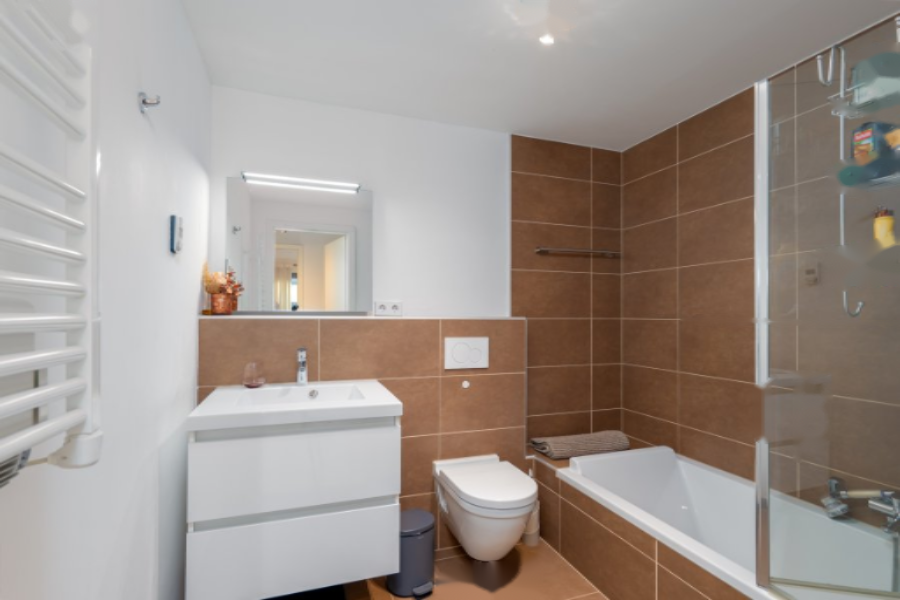Ванная комната практична и продумана, оснащена как ванной, так и отдельной душевой кабиной, что идеально для повседневного удобства.