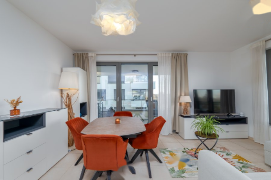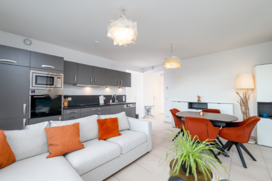 Эта стильная квартира площадью 60 м² предлагает светлую и комфортную жилую зону с просторной открытой кухней и гостиной.