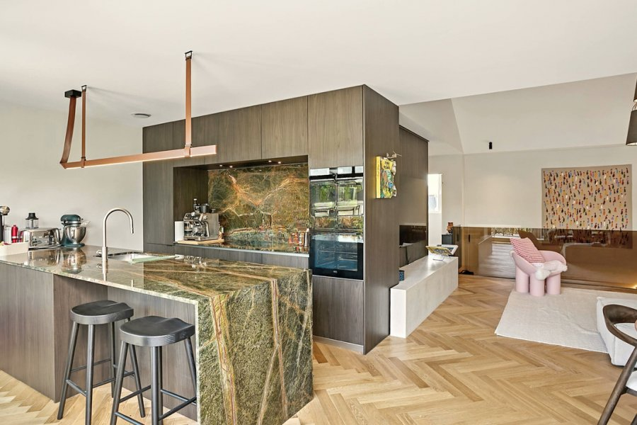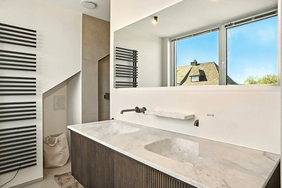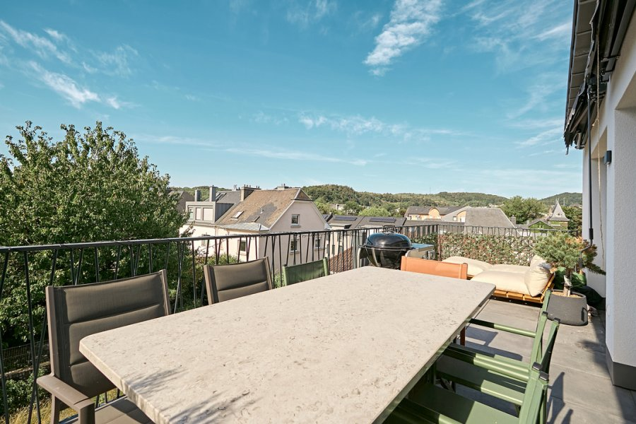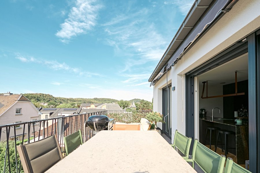 Высококачественные материалы и отделка используются повсеместно, создавая утончённую и вневременную обстановку. Из гостиной открыт выход на красивую террасу, ориентированную на юг, с достаточно местом для шезлонгов, обеденного стола и барбекю. Отсюда открывается потрясающий панорамный вид на крыши города, церковь и лес на горизонте — действительно особенное место для повседневной жизни и развлечений.