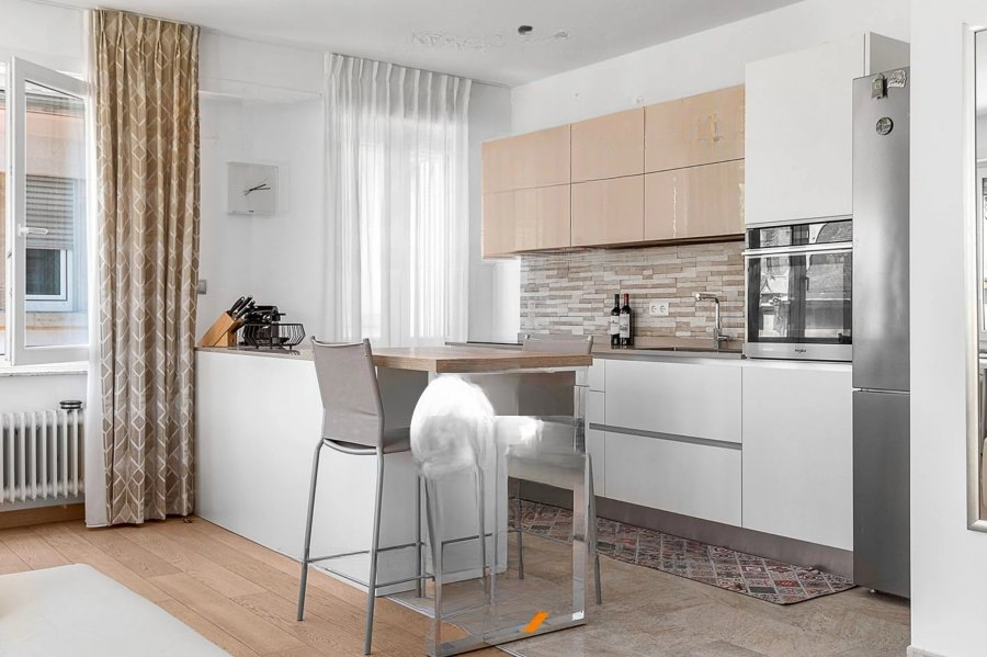 Квартира находится на 3 этаже резиденции из 10 единиц с лифтом. После ремонта, проведенного в 2018 году, она покоряет своей светлостью и открытым видом на город. В просторной и светлой гостиной площадью около 47 м² объединены лаунж-зона, столовая и великолепная кухня бренда LUBE с центральным островом. С обеих сторон апартаментов расположены две спальни площадью около 10 м² и 13 м², а также элегантная душевая с WC, биде и встроенным душем. Вся квартира имеет паркетные полы, что создаёт теплую, современную атмосферу.