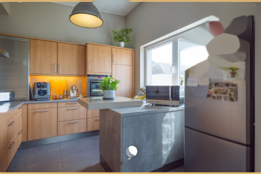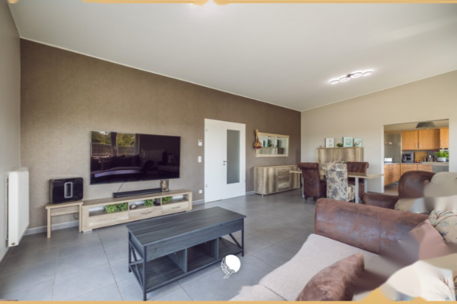 - Площадка, полностью оборудованная кухня, открытая в гостиную/столовую (около 50 м²) с большими панорамными окнами, ведущими на террасу.