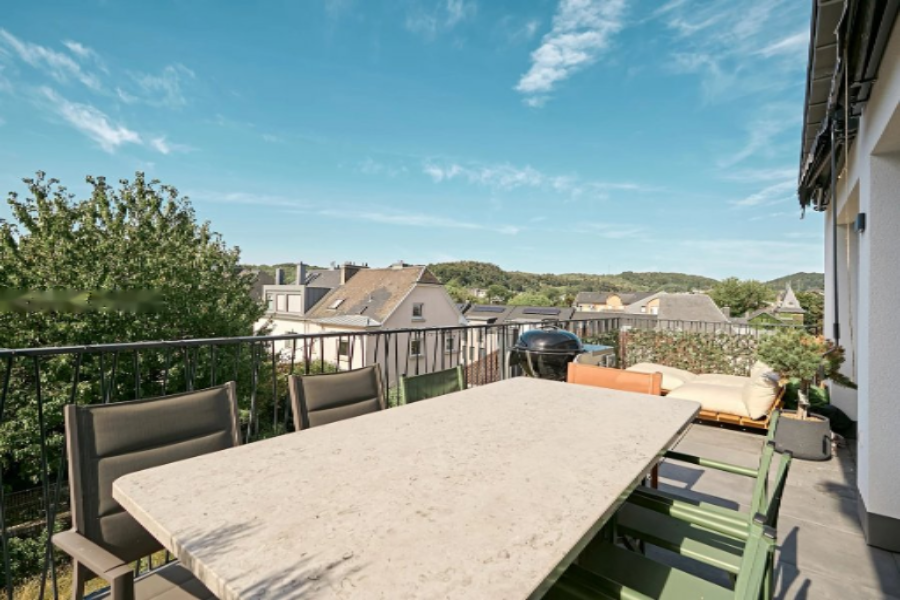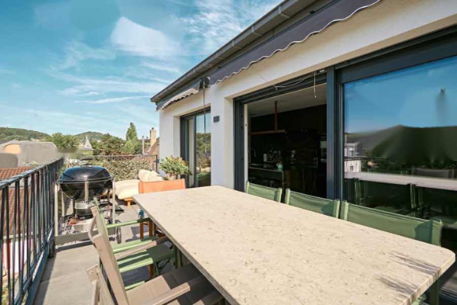 Из гостиной имеется прямой выход на террасу, ориентированную на юг, что позволяет пользоваться всеми преимуществами жизни на открытом воздухе. Это пространство предлагает место для мебели, обеденного стола и барбекю, а также открытый панорамный вид на крыши города, церковь и лес на горизонте.