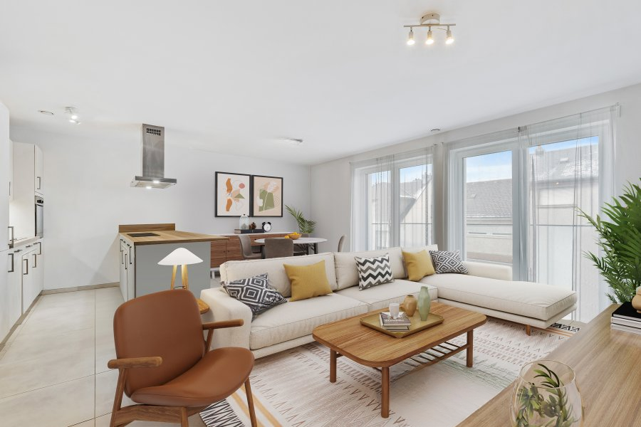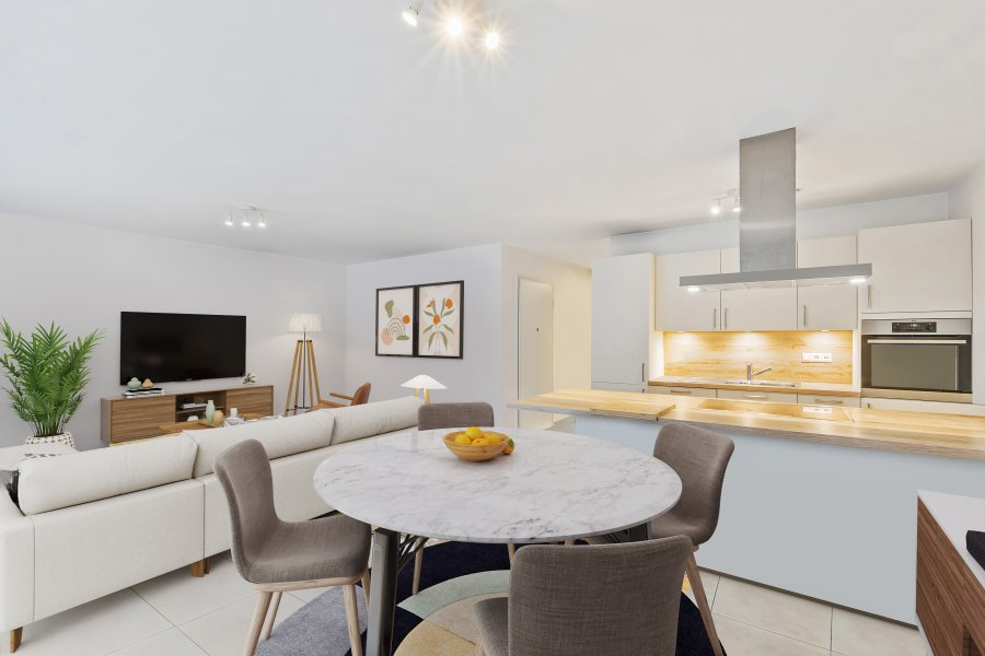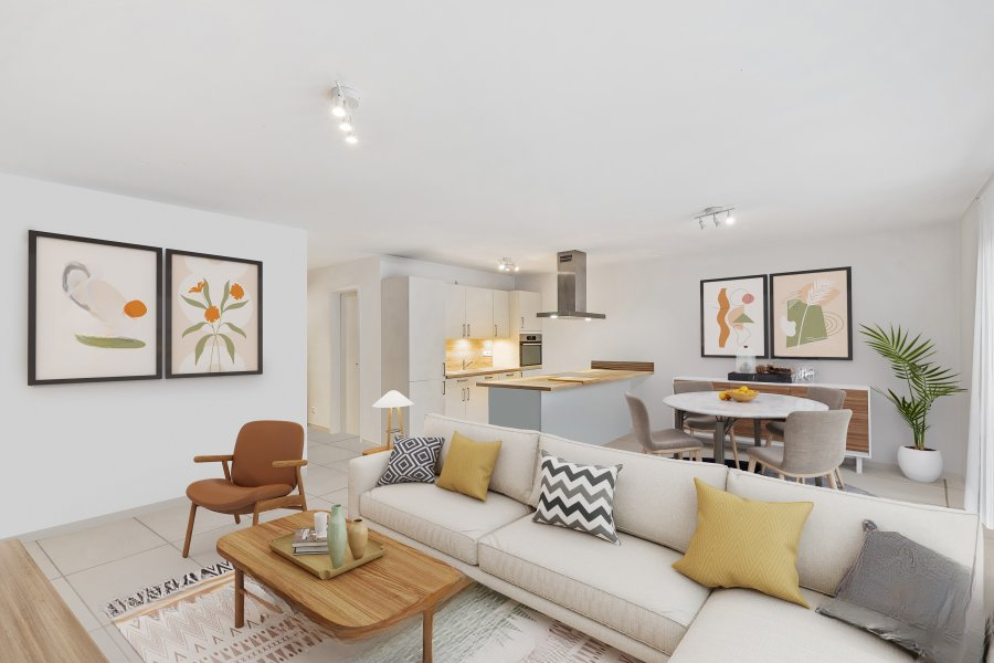 Полностью оборудованная кухня открыта в гостиную и столовую, создавая светлое и дружелюбное пространство, с прямым доступом к балкону, идеальному для отдыха на свежем воздухе.