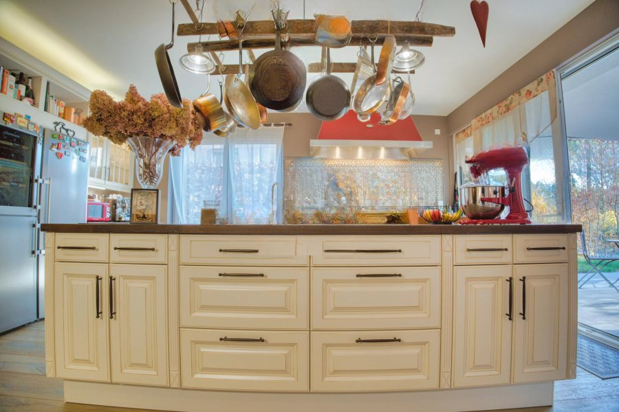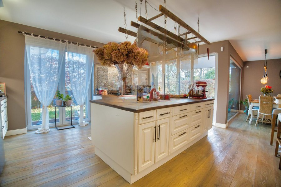 Состоит из открытого холла с модульным встроенным гардеробом на заказ, обширной светлой гостиной с массивным дубовым паркетом, с выходом на террасу и в сад, полу-профессиональной открытой кухни, полностью оборудованной (газовая плита на 5 конфорок, двойная духовка, винный шкаф, холодильник, морозильник, большой центральный остров, множество мест для хранения) — идеальной для дружеских встреч. Зона отдыха включает 2 спальни (14 м² и 10,5 м²), полную ванную комнату с автентичным дизайном с двойной раковиной, ванной и большой душевой кабиной на заказ, сочетающие плитку "метро", ретро-плитку и бетонную нишу, а также отдельный туалет.