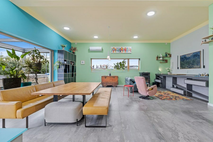 Финишная отделка включает крупноформатную плитку и имитацию паркета, антирезонансные двери и москитные сетки на окнах. Дом оснащён крупной системой солнечных панелей, зарядной станцией для электромобилей, кондиционированием и подогревом пола.