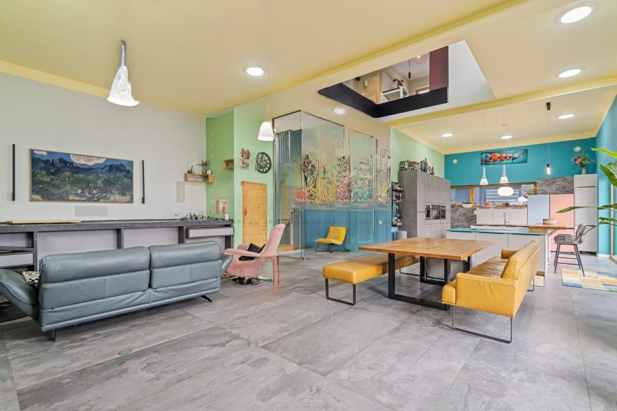 Передовое архитектурное решение делает этот дом уникальным благодаря функциональности и открытому пространству. Просторная гостиная, центр дома, впечатляет высотой потолка более 3 метров, встроенным камином и видом на галерею первого этажа, создавая тёплую и элегантную атмосферу.