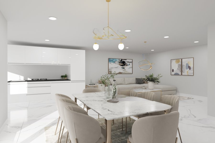 С жилой площадью около 100 м², квартира включает в себя: просторную гостиную с открытой кухней и прямым выходом на большую террасу площадью 34 м², идеально подходящую для приятного времяпрепровождения на свежем воздухе.