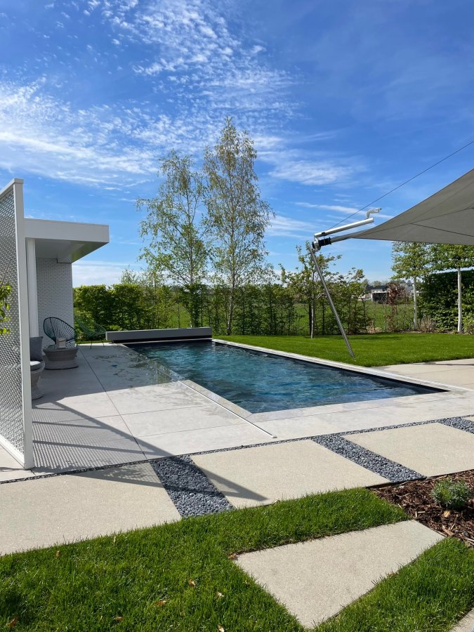 Внешнее пространство включает в себя бетонный бассейн с покрытием Ecofinish и автоматизированными системами, деревянный садовый домик площадью 12 м² с фасадом из расширенной металлической решетки, и две террасы площадью примерно 25 м² и 45 м², что обеспечивает высокий уровень уединения.