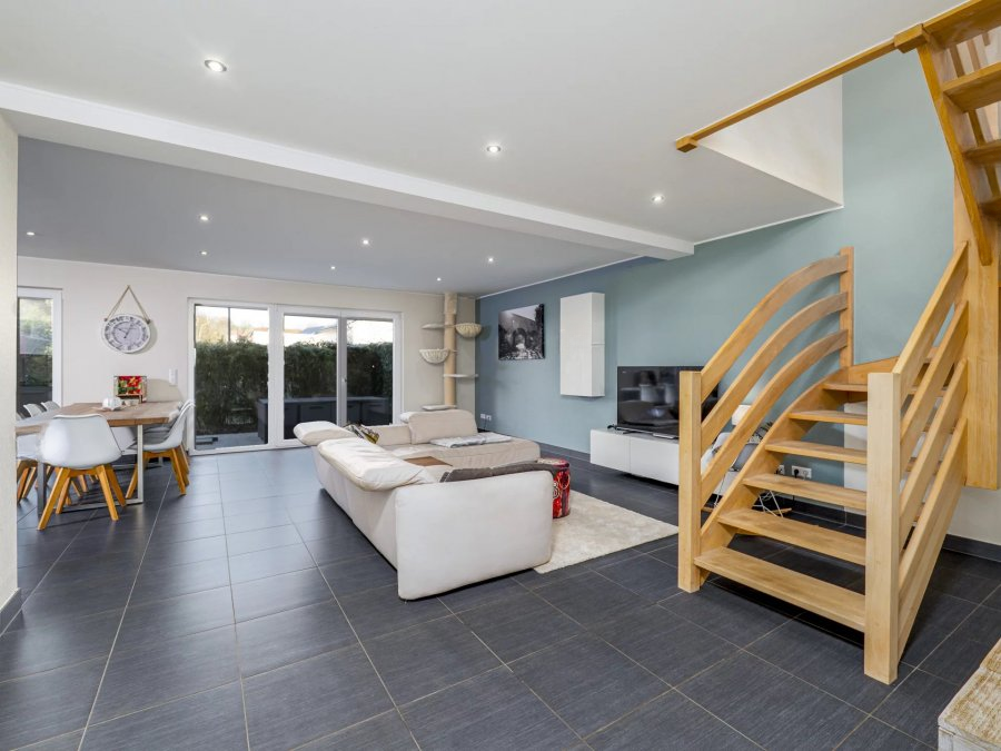 Очаровательный смежный дом, расположенный на очень тихой улице в BIWER. Дом включает в себя: на первом этаже — прихожая, гараж с прачечной и котельной, отдельный туалет, большая гостиная с открытой оборудованной кухней с выходом на террасу и в сад.