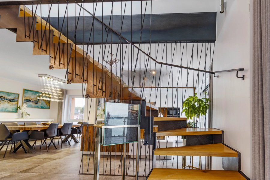 Внутри вас ждет элегантный и функциональный интерьер с несколькими уровнями и высококачественной отделкой. Просторная гостиная площадью более 56 м² с камином и полностью оборудованной кухней с доступом к южной террасе дарит уют и комфорт.