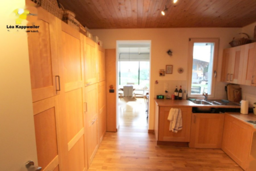 Открытый холл ведет в просторную гостиную и столовую с открытым камином. Пристройка включает большую отапливаемую веранду площадью около 31 м². Прямой выход на террасу и обширный сад. Полностью оборудованная смежная кухня.