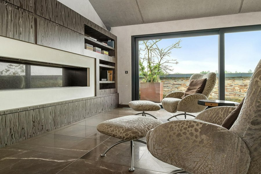 Помещения для приемов, залитые светом благодаря широким оконным проемам, создают атмосферу, которая одновременно минималистична и тепла. Современный камин изящно структурирует гостиную, а кухня с островом из нержавеющей стали и встроенными винными погребами выделяется как истинное архитектурное произведение.