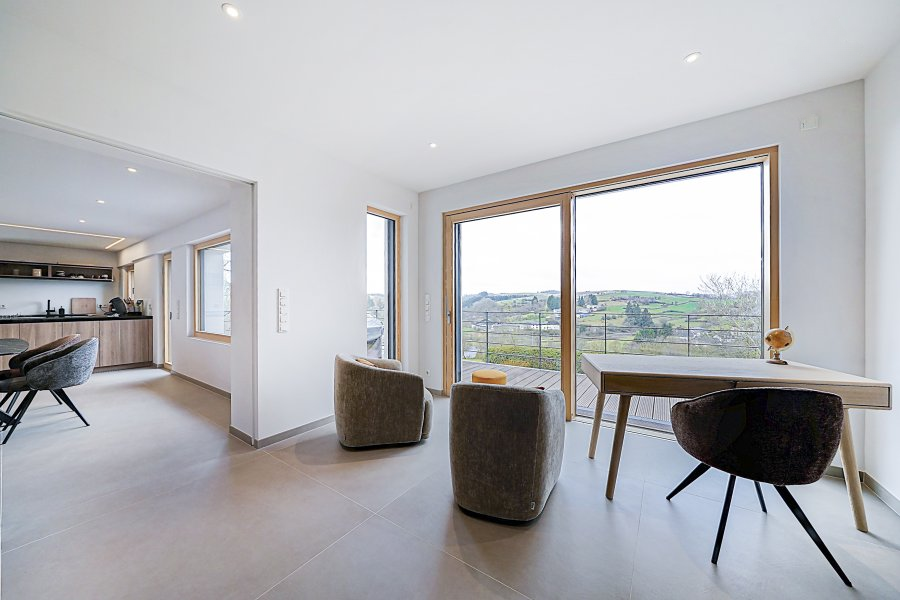 На первом этаже расположен просторный вход с мебелью по индивидуальному заказу, дополненный отдельным туалетом. Центр дома - светлая жилая зона с гостиным пространством, столовой и полуукрытой кухней. Через большие окна открывается доступ к подвесной террасе с захватывающим видом на долину Сюрре.