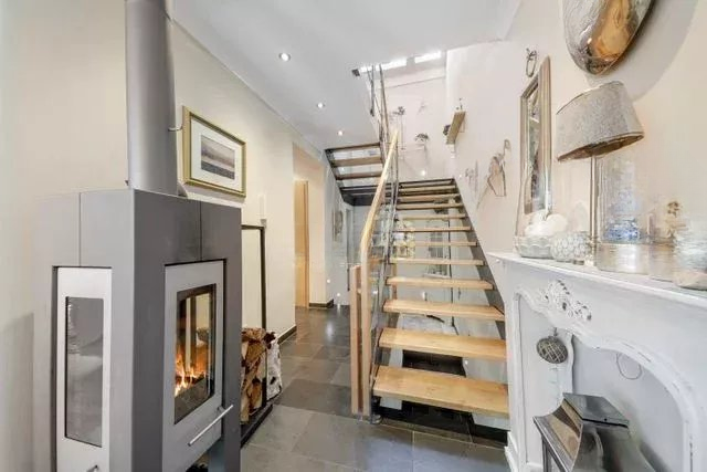Дополнительные удобства включают электрические рольставни, систему сигнализации и пылесос Husky. В коридоре и лестничной клетке предусмотрены детекторы движения для света, а также оптоволоконное подключение.
