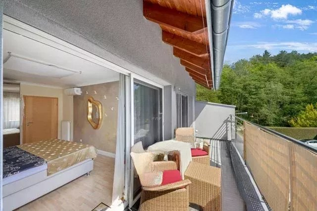 Великолепный триплекс с частным входом, расположен в тихом тупике возле леса. На первом этаже находится гараж с электрическими воротами и отдельное подсобное помещение с прямым доступом в дом. Просторный и светлый холл приветствует вас с открытым душем и зоной велнес/хамам. Перед гаражом предусмотрено парковочное место.