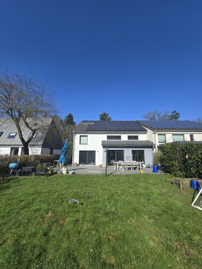 На участке: большая терраса 48 м², сад 130 м², гараж на 2 автомобиля с электрической зарядной станцией, внешняя парковка на 3 автомобиля. На крыше установлены 30 м² солнечных панелей, электричество бесплатно.
