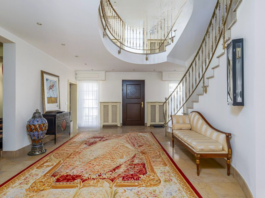 В подвале: спальня с собственной ванной комнатой и туалетом, спортивный зал, винный погреб, прачечная, летняя кухня, кладовая и два закрытых моторизированных гаража для трех автомобилей.