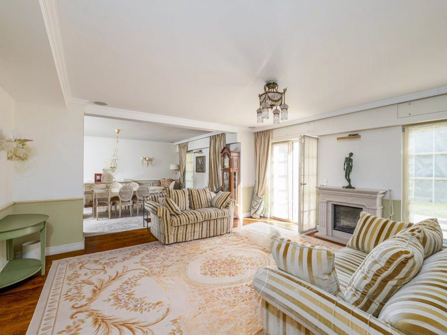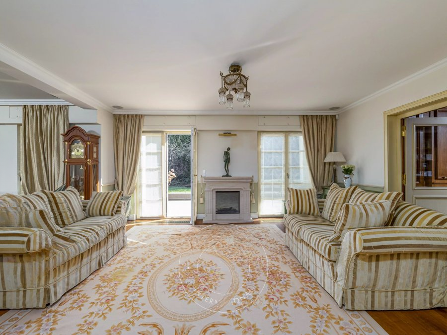 На первом этаже: парадный коридор с мраморной лестницей, двойная гостиная с камином, библиотечный офис с выходом на обширную террасу площадью +/- 75 м² и лесной сад. Вторая гостиная, встроенная кухня с камином, гардеробная и гостевой туалет.