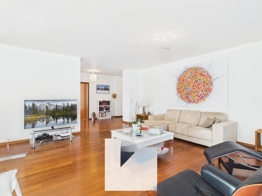 Входная дверь ведет в холл площадью примерно 6 м², переходящий в светлую и просторную гостиную с массивным паркетом площадью около 55 м², с выходом на балкон площадью 10 м². Также доступна открытая, полностью оборудованная и меблированная кухня с выходом на балкон площадью около 2.5 м². Просторная спальня площадью 18 м² с двумя гардеробными на 7.5 м² и 1.5 м² имеет смежную ванную комнату площадью 5 м².
