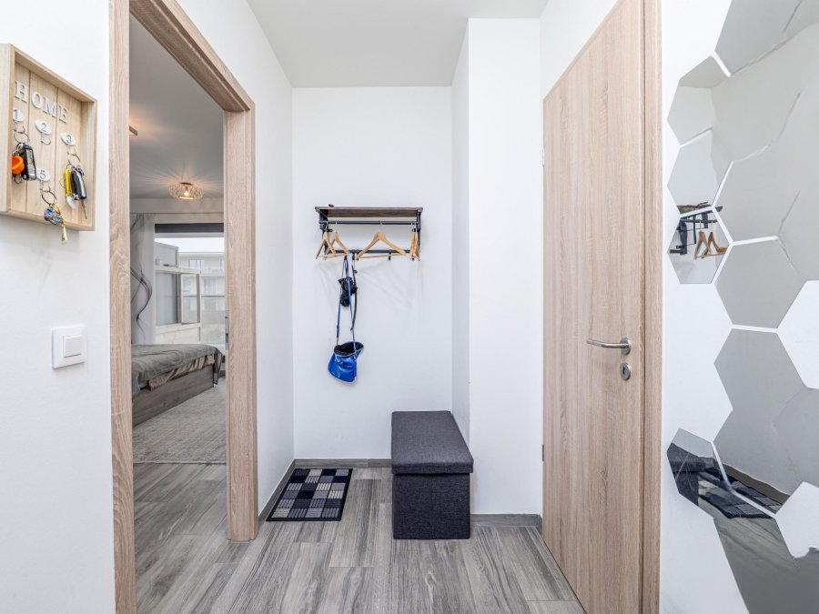 Квартира включает в себя светлую гостиную с открытой кухней, комфортную спальню и современную душевую. В прихожей есть кладовая, которую можно переоборудовать в прачечную. Балкон площадью 6,58 м² идеален для наслаждения солнечными днями. В комплекте идет подземный склад и парковочное место.