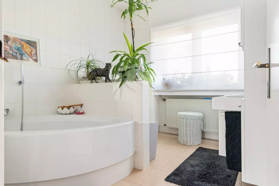 Холл ведет в различные жилые комнаты. Слева — светлая гостиная на фасаде дома. Справа — столовая, также ориентированная на фасад, предлагающая удобное пространство для приема пищи. На задней стороне находится отдельная кухня с прямым выходом на террасу, укрытую маркизой, идеально подходящую для отдыха на свежем воздухе. Также сзади расположены спальня и ванная комната с ванной, двойным умывальником и туалетом. Из кухни лестница ведет на этаж.