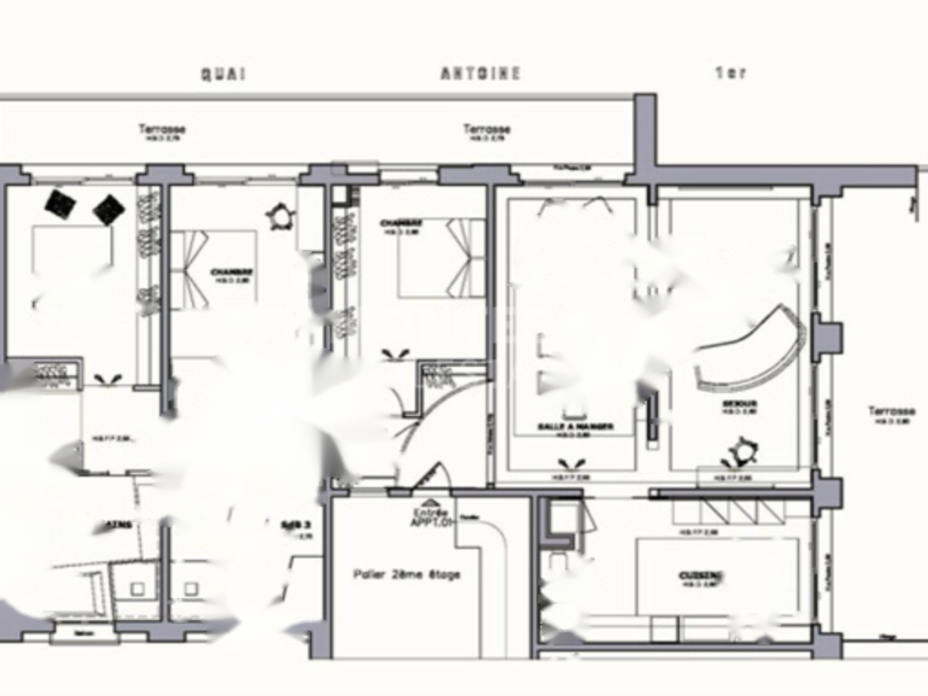 Апартаменты состоят из четырех комнат, объединяющих две единицы. Недавно в них были проведены значительные ремонтные работы. Современное оформление включает в себя индивидуальную мебель от итальянских мастеров, систему сигнализации и видеонаблюдения, независимую систему отопления и кондиционирования воздуха, внешнее отопление, позволяющее пользоваться террасой круглый год, и музыкальную систему Sonos. Планировка: холл с гардеробом, гостиная, столовая, кухня, кладовая, гостевой туалет, балкон с видом на Fort Antoine, балкон с видом на Port Hercule и город, 3 спальни, 3 ванные комнаты, гардеробная и многочисленные шкафы.