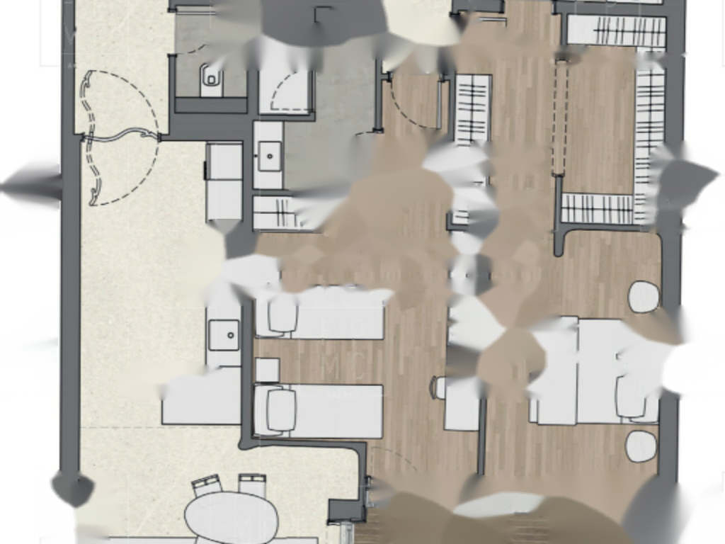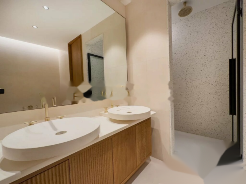 Трехкомнатная квартира включает холл, ведущий в гостиную/столовую с открытой кухней, просторную главную спальню с гардеробной и ванной комнатой, вторую спальню с душевой, кладовую, гостевой туалет и гардеробную, а также террасу. Два парковочных места и подсобное помещение дополняют этот объект. ️