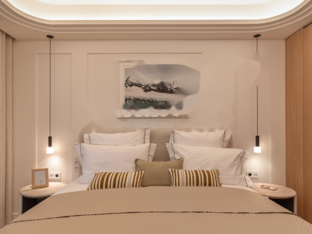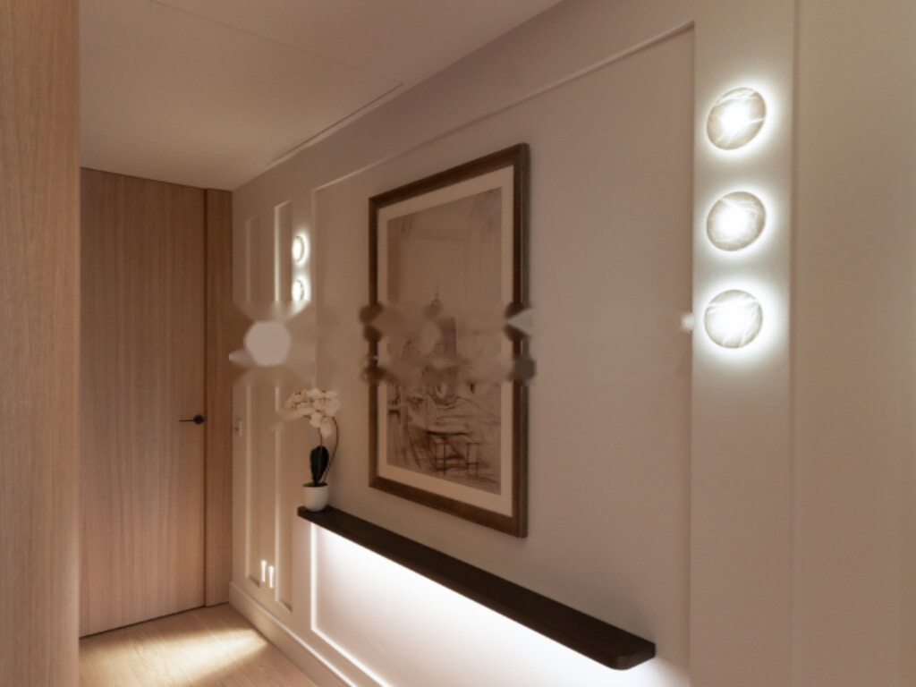 Просторная гостиная выходит на ландшафтную террасу, с которой открывается потрясающий вид на Place du Casino. Дизайн кухни и столярных элементов гармонично вписывается в интерьер, создавая утончённое и цельное пространство. Освещение Kreon подчёркивает атмосферу и раскрывает каждую деталь.