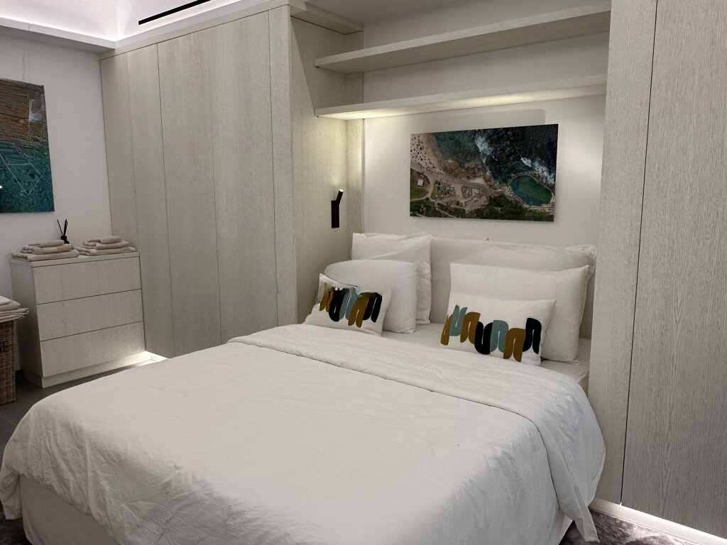 Интерьеры украшены встроенными шкафами, кухня полностью оборудована в американском стиле, есть прачечная и большая гостиная. В спальне также шкафы и ванная комната, а также вторая душевая. Для удобства есть кондиционер с реверсивным режимом.